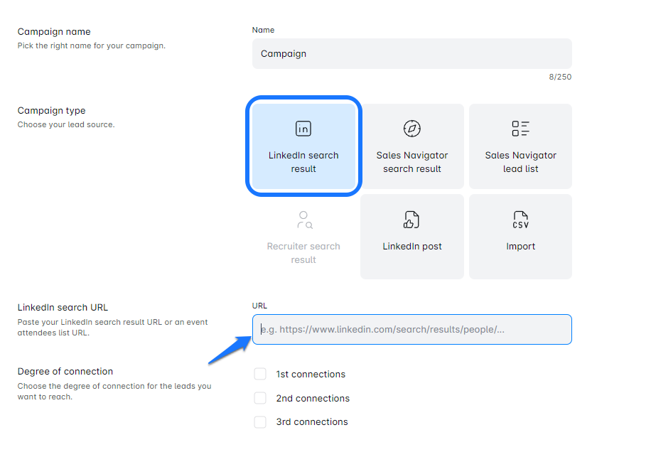 In LeadsULove, paste your LinkedIn search URL into the designated area. Give your campaign a name that resonates with your goals.