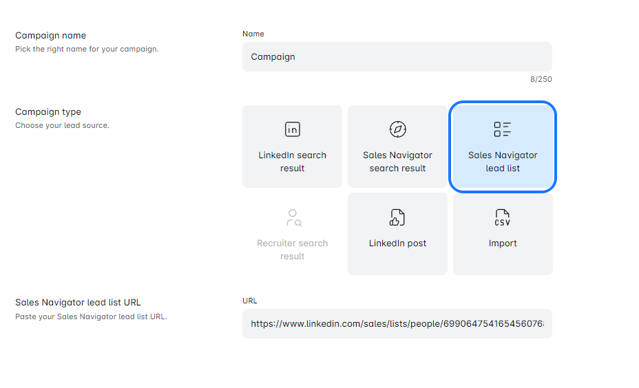 - Once you’ve filled your list with leads, it’s time to set up your campaign! Copy the URL of your Leads List, paste it into the designated area in the LeadsULove, and give your campaign an awesome name.