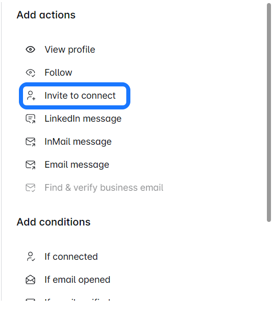 - Find the Campaign Builder: Look to the right side of the screen, where you’ll see the 'Invite to Connect' option among other actions.