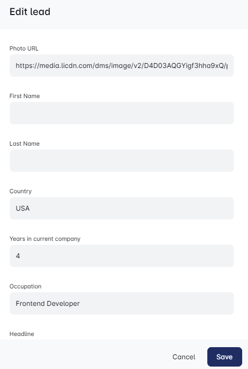 - To update details such as a lead’s name or current company, just add the new information you want.