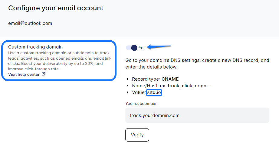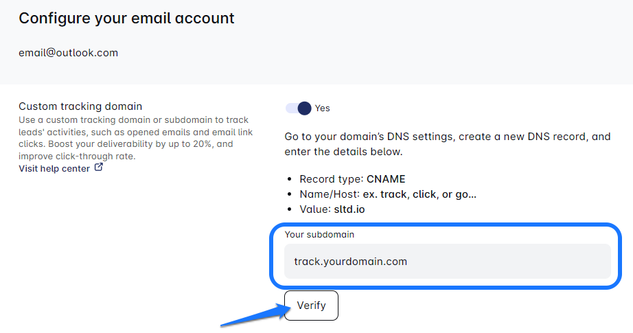 - Enter your custom tracking domain in the LeadsULove’s Your Domain field (e.g., track.yourdomain.com), then click the Verify button to verify it.