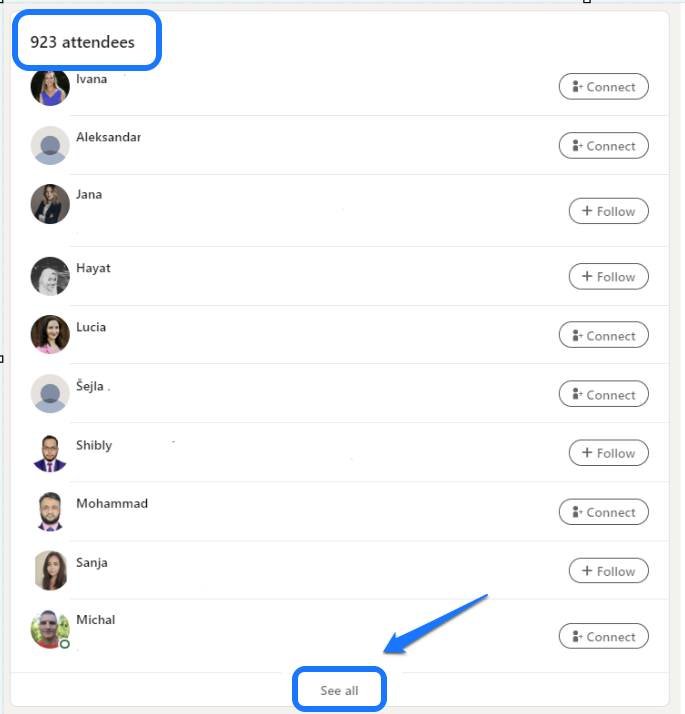 Step 2: Access the Attendee List Once you’ve signed up, you can check out the list of attendees! Simply click on "See all" attendees within the event page. 🙋‍♂️🙋‍♀️