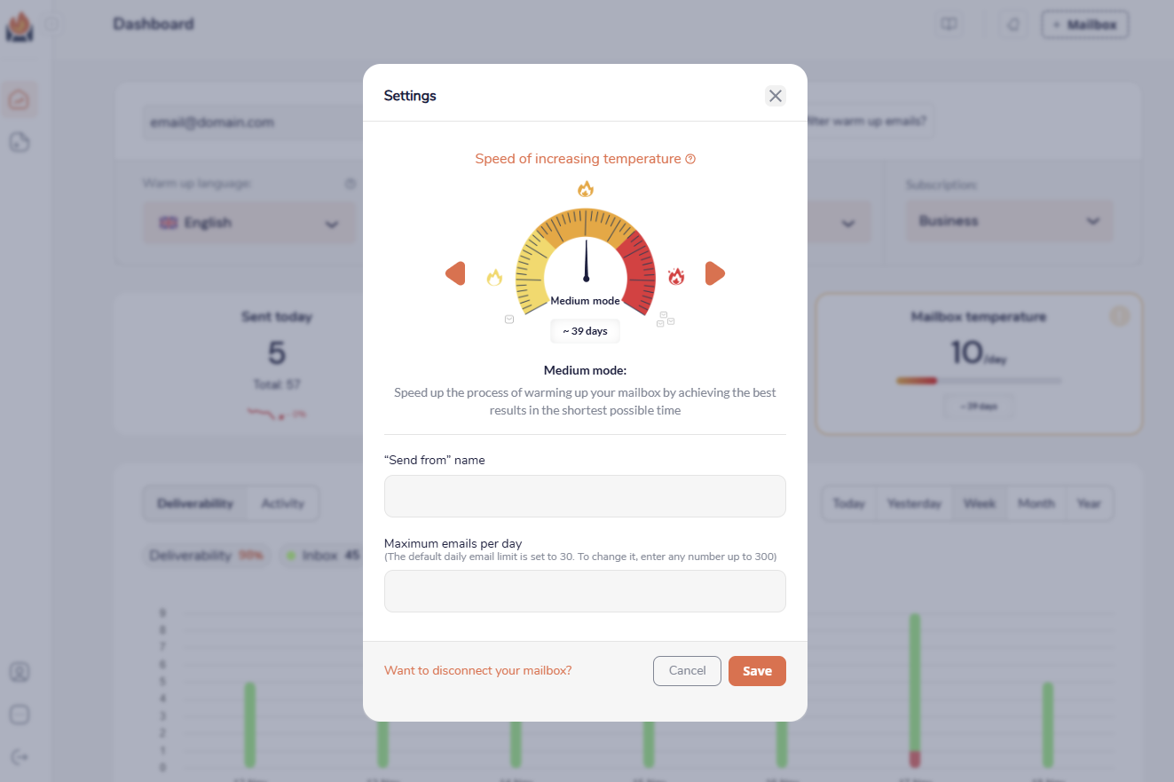 1. Go to Settings to set the temperature of your warm-up process. Depending on the temperature you choose, the tool will send different amounts of emails for different periods of time. You will have default settings for each temperature, but you can also set them yourself. 🔥