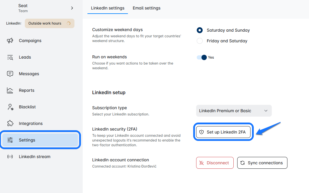1. Open LinkedIn 2FA Settings in LeadsULove ⚙️
