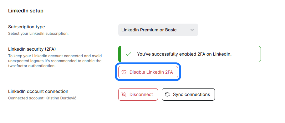 No problem. You can disable it anytime by heading back to the same spot and clicking Disable LinkedIn 2FA.